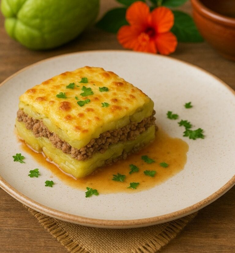 GRATIN DE CHAYOTES ET POMMES DE TERRE AU HACHIS DE BOEUF ET PORC